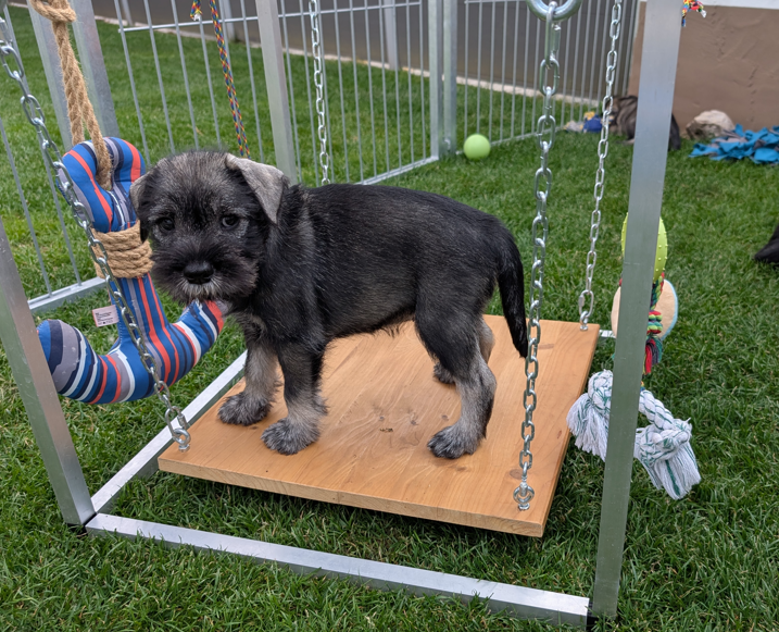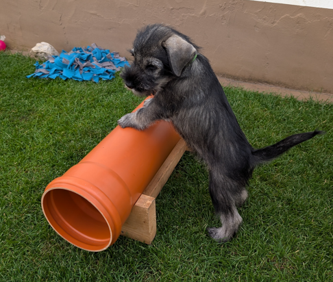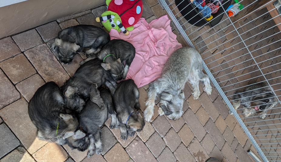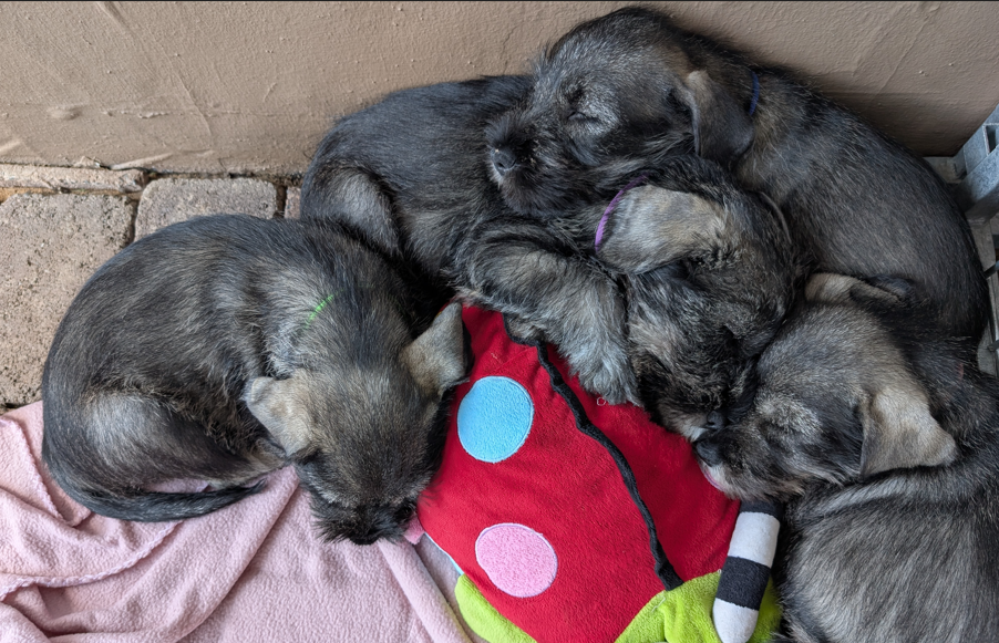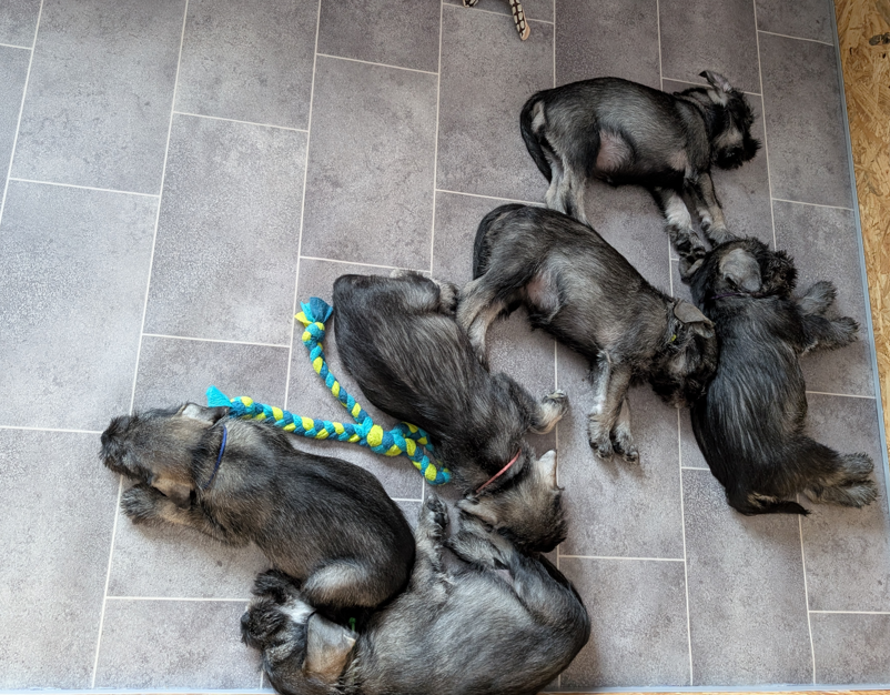 Die Rasselbande hat in dieser Woche wieder enorme Fortschritte gemacht. Wie rasant die Entwicklung fortschreitet, ist immer wieder ein Phänomen. Die Spiele werden wilder und rauer und die Koordination und Balance wird jeden Tag besser. Ebenfalls sind sie in dieser Woche wesentlich aktiver und wacher. Viele Besucher waren hier und haben die Kleinen beschmust und bespielt, was ihnen außerordentlich gut gefällt. Sie sind offen und neugierig allem Neuen gegenüber, sind mittlerweile erprobt in allen Alltagsgeräuschen, auch der Rasenmäher, die Bauarbeiten in der Straße, die Müllabfuhr, das Martinshorn der vorbeifahrenden Krankenwagen und der Staubsauger lassen sie mittlerweile sehr entspannt über sich ergehen. Wir haben in dieser Woche auch Übungen gemacht, wie das "Sitz und Warten" und der große blaue Tunnel genauso wie das Bällebad wurde mit Freude ausprobiert.