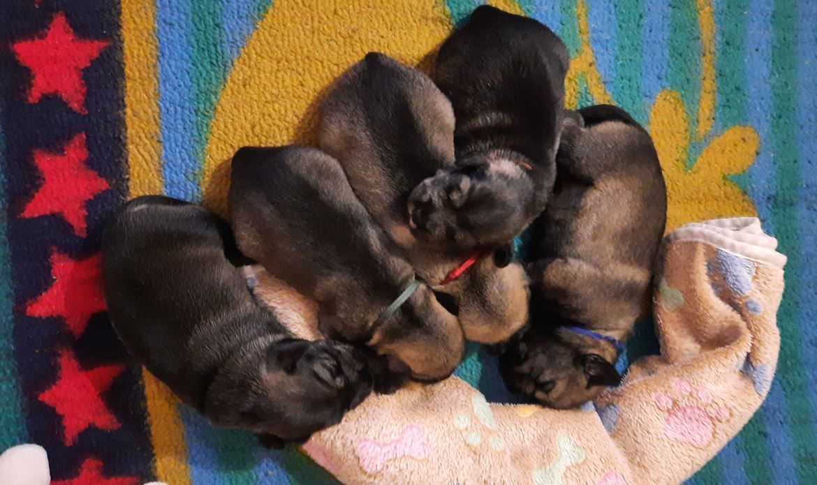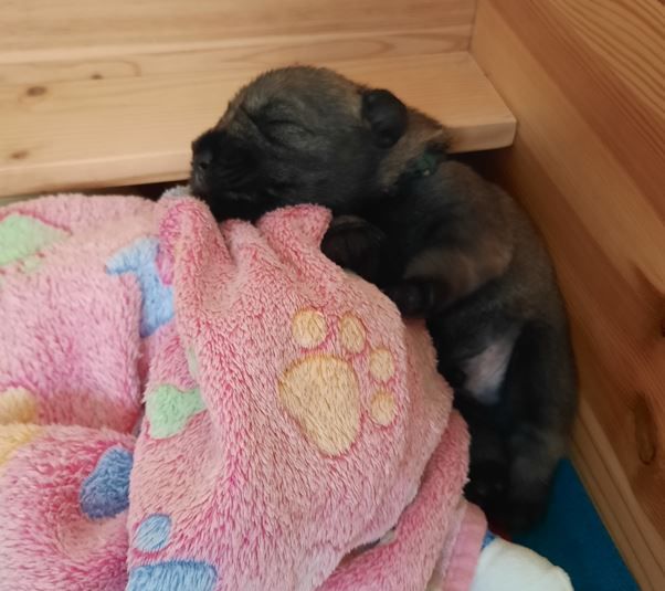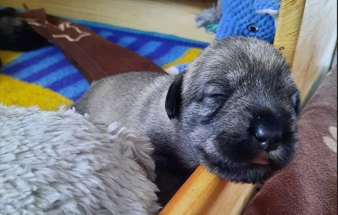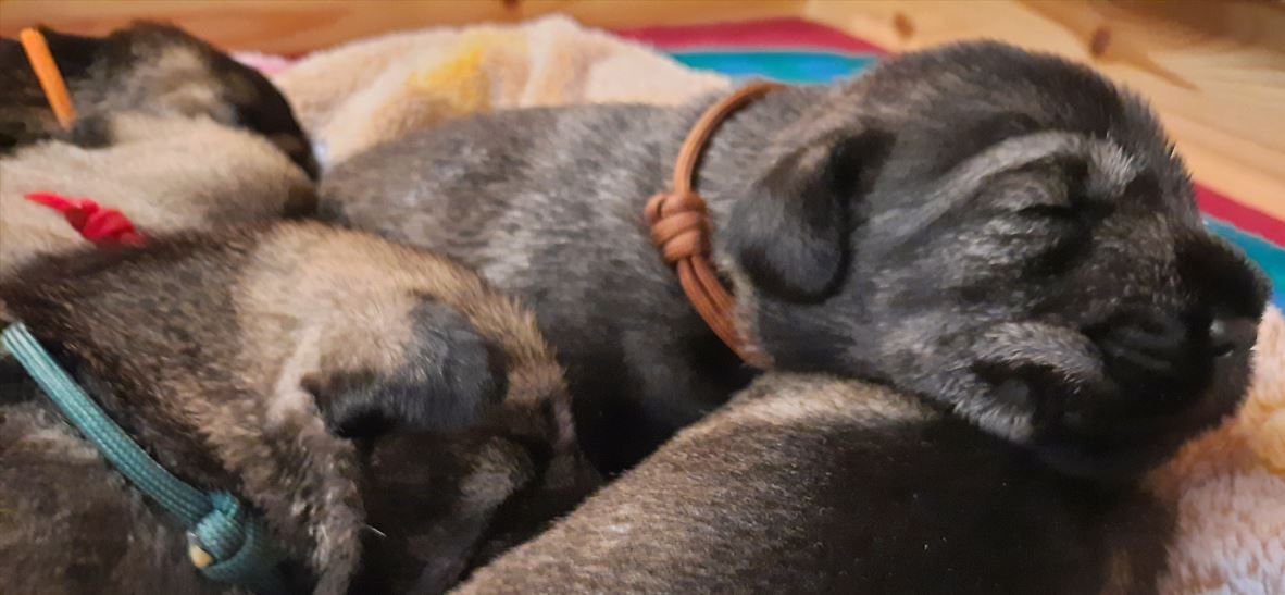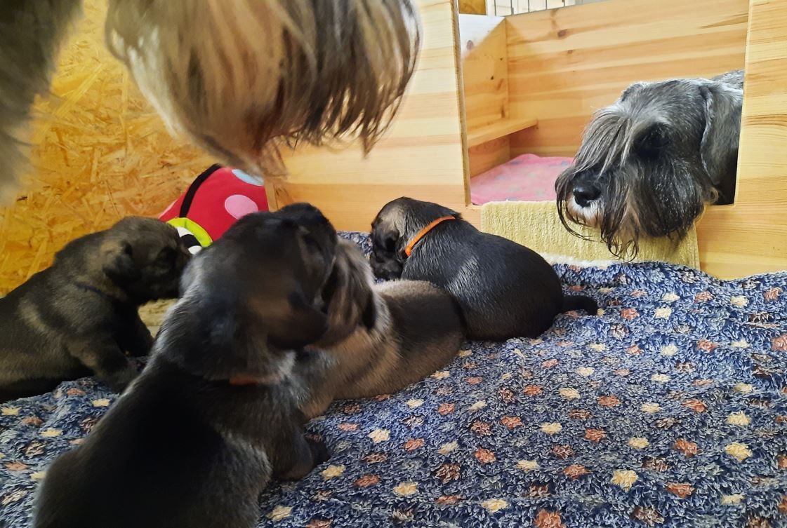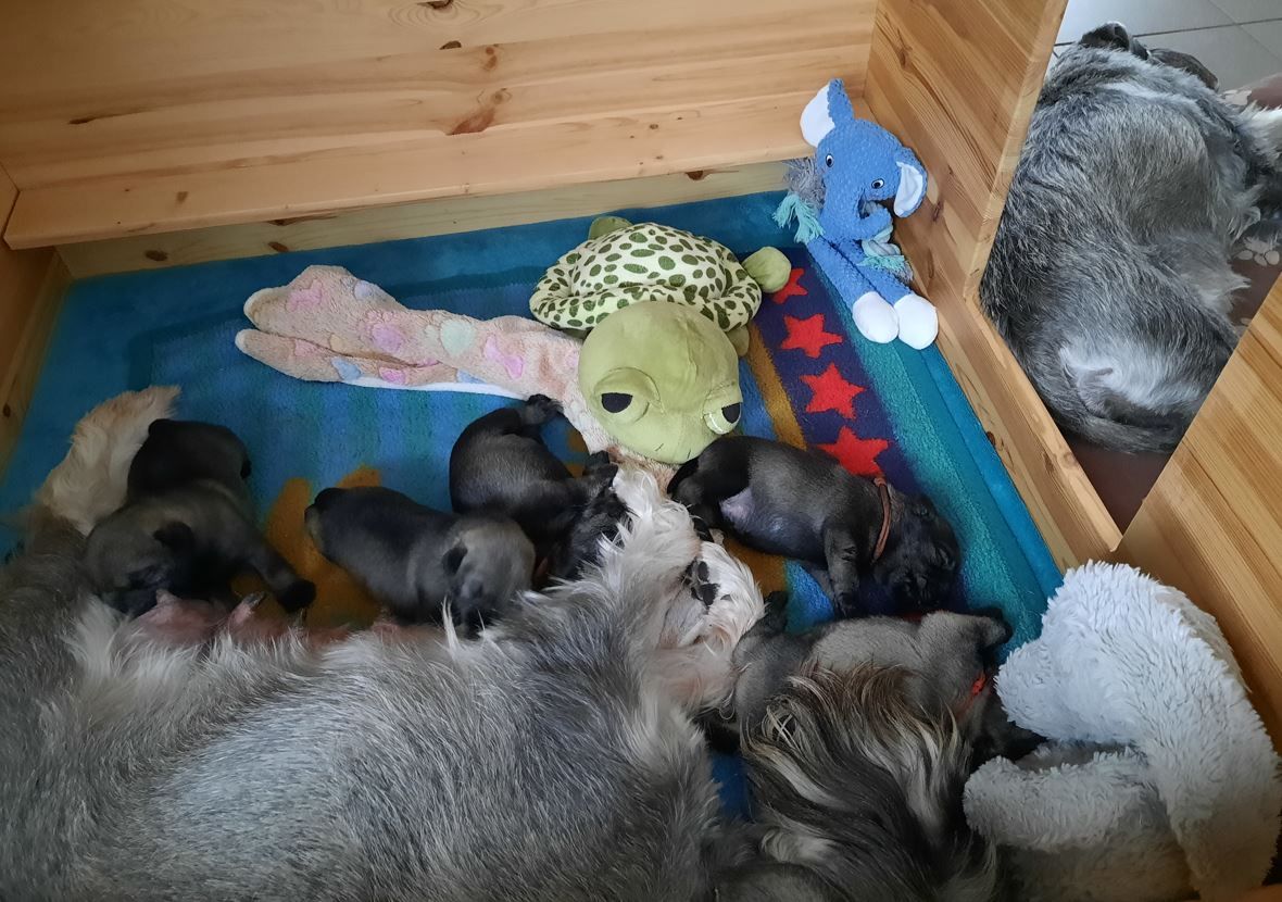 Diese Woche haben die kleinen Racker viel erlebt. Sie sind mitsamt der Wurfbox in den großen Welpenauslauf umgezogen. Da dieser Wurf ein sehr gemütlicher Wurf ist, sind die Schnauzis noch nicht so richtig auf Entdeckertour gegangen. Aber das kommt noch, da bin ich absolut sicher. Wir haben schon mal probiert, etwas Beifutter zu geben. Es wird auch geschleckt, aber bei Mama schmeckts scheinbar immer noch am Besten. Den Tag verbringt die 5er-Gang hauptsächlich mit Schlafen. Das große Geschäft wird aber schon außerhalb der Wurfbox erledigt. Für "unfallfreies" Pipi ist der Weg noch etwas zu weit, das schaffen sie meist noch nicht. Alle Augen sind offen und hören scheint auch zu funktionieren. Mama putzt alle sehr sorgfältig und kuschelt ausgiebig mit ihren Kleinen. Alle mögen gerne auf den Arm genommen werden und genießen das Streicheln. Diese Woche haben alle wieder ordentlich zugelegt...
