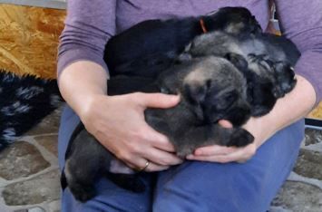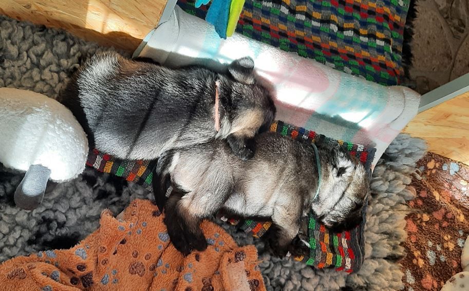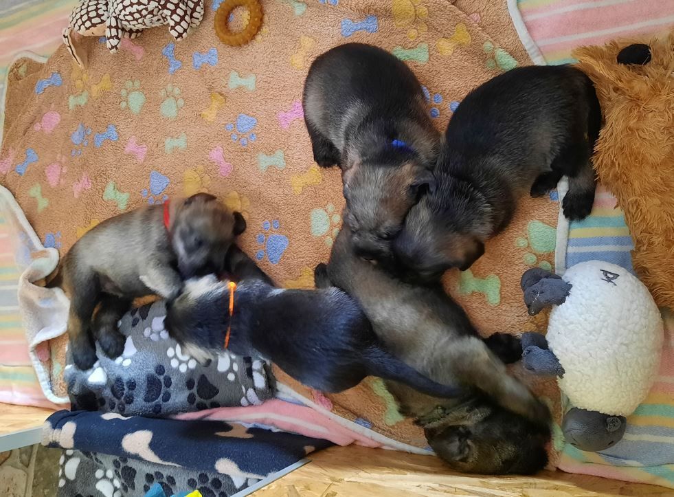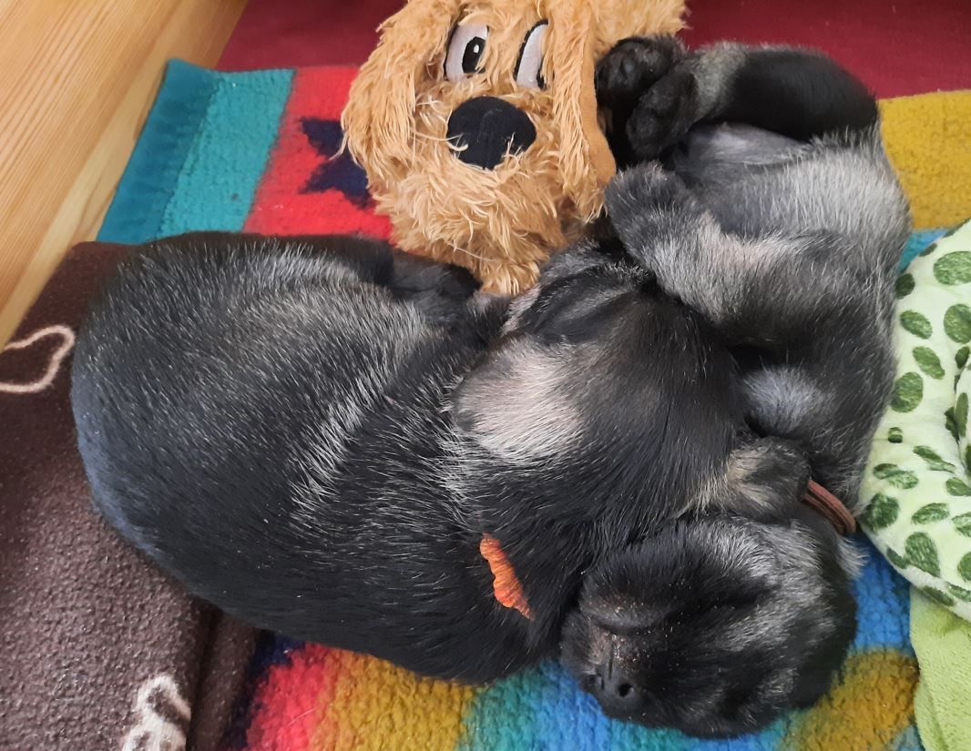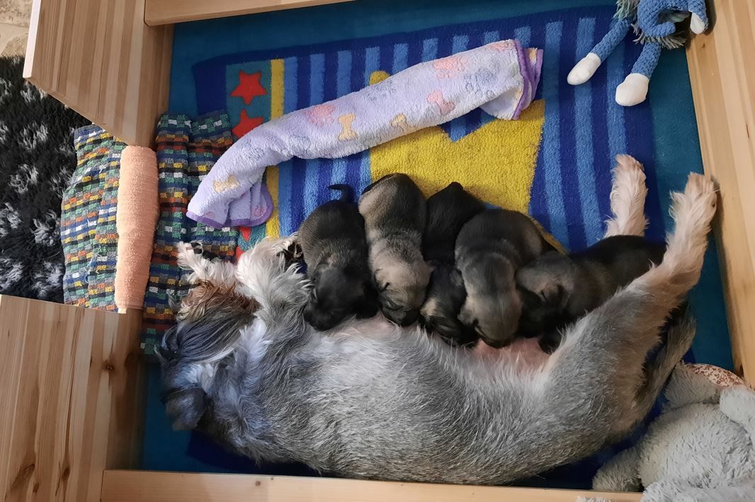 Wieder ist eine Woche vergangen und die kleinen Schnauzer haben große Fortschritte gemacht. Sie haben Spielsachen und neue Mahlzeiten entdeckt, sind in den großen Welpenauslauf mit Kuschelecke umgezogen und haben festgestellt, dass man mit Oma Ophelia prima spielen kann. Die Zähnchen sind in dieser Woche durchgebrochen und werden auch fleißig an allem ausprobiert. Mama findet das nicht soooo toll und möchte die Kleinen nicht mehr trinken lassen. Rechtzeitig haben wir deshalb auf Welpenbrei umgestellt, was erfahrungsgemäß einige Tage dauert, bis es angenommen wird. Aber das haben die Kleinen prima gemeistert. Krallen wurden auch noch einmal geschnitten und sie haben schon mal Bekanntschaft mit der kleinen Schermaschine gemacht. Die Haare an Po und Füßchen mussten bereits etwas gekürzt werden und gebürstet haben wir das Babyfell auch schon. Das war für alle kein Problem. Alle sind sehr anhänglich und lieben es, gestreichelt und auf den Arm genommen zu werden. Einer der Rüden wird nach Minden zu unserem Bobby als Zweithund gehen, er soll Fritz heißen. Darüber freuen wir uns sehr. Ordentlich zugelegt haben sie außerdem....